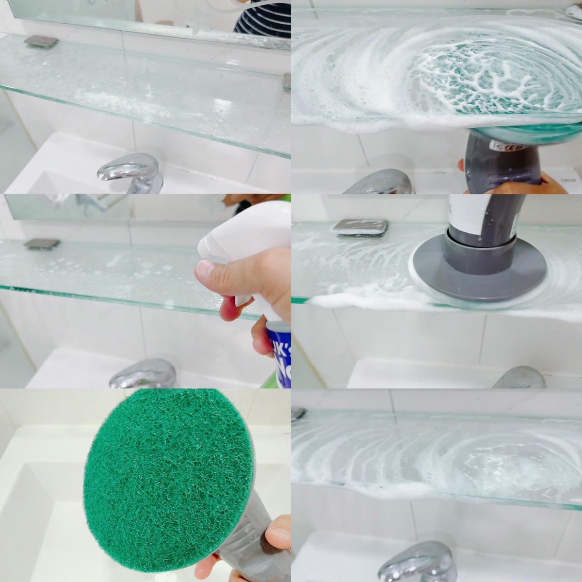 像是浴室玻璃檯面的水垢或牙膏垢,用菜瓜布刷頭來刷,真的超省力!