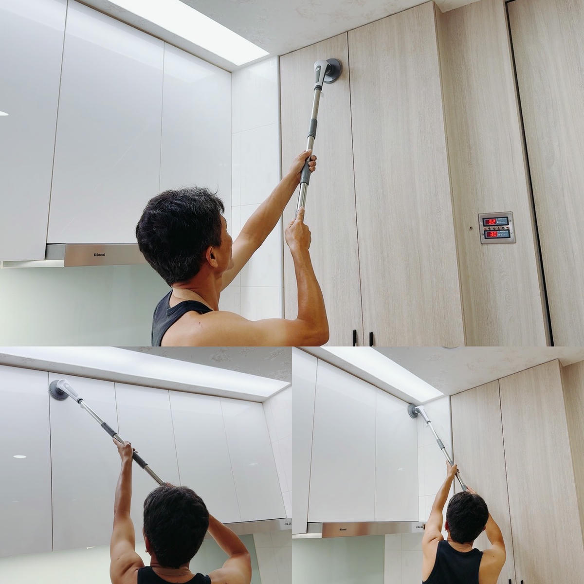 另外,像廚房櫃子的高處,我會換上毛巾布刷頭,再加上延長桿使用,