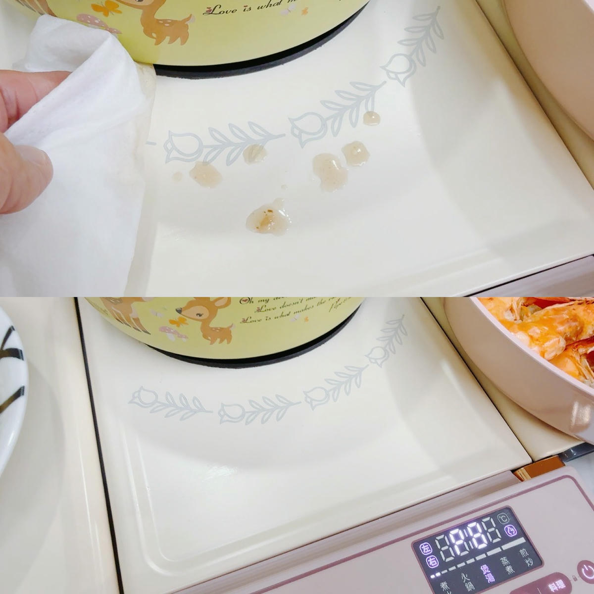 不論是湯汁、油污、醬料滴到面板上,只要用 濕布或濕紙巾輕輕一擦就乾淨如新,