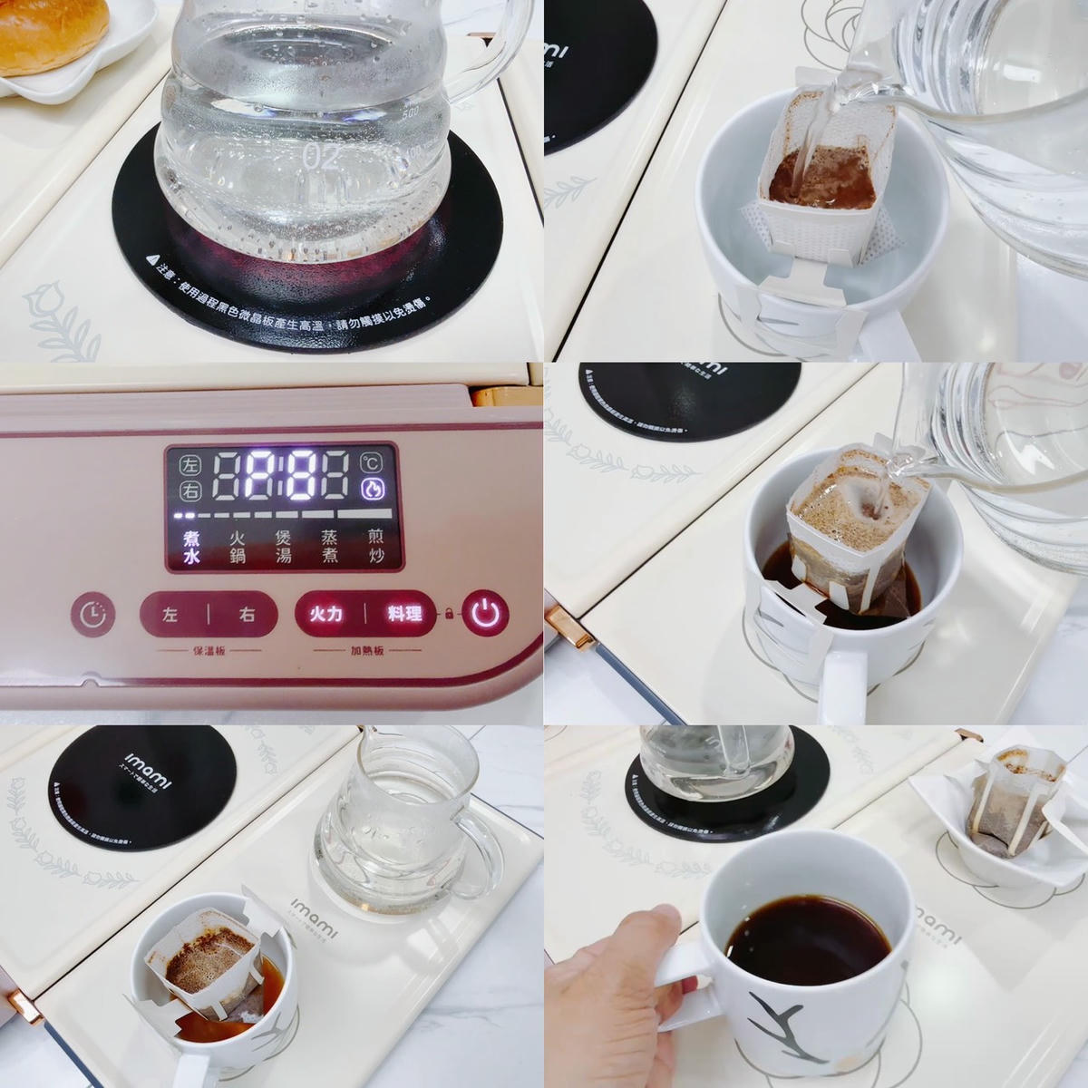 水煮開後倒入濾掛咖啡,香氣立刻散出來,在餐桌上就能沖好一杯熱呼呼的咖啡。