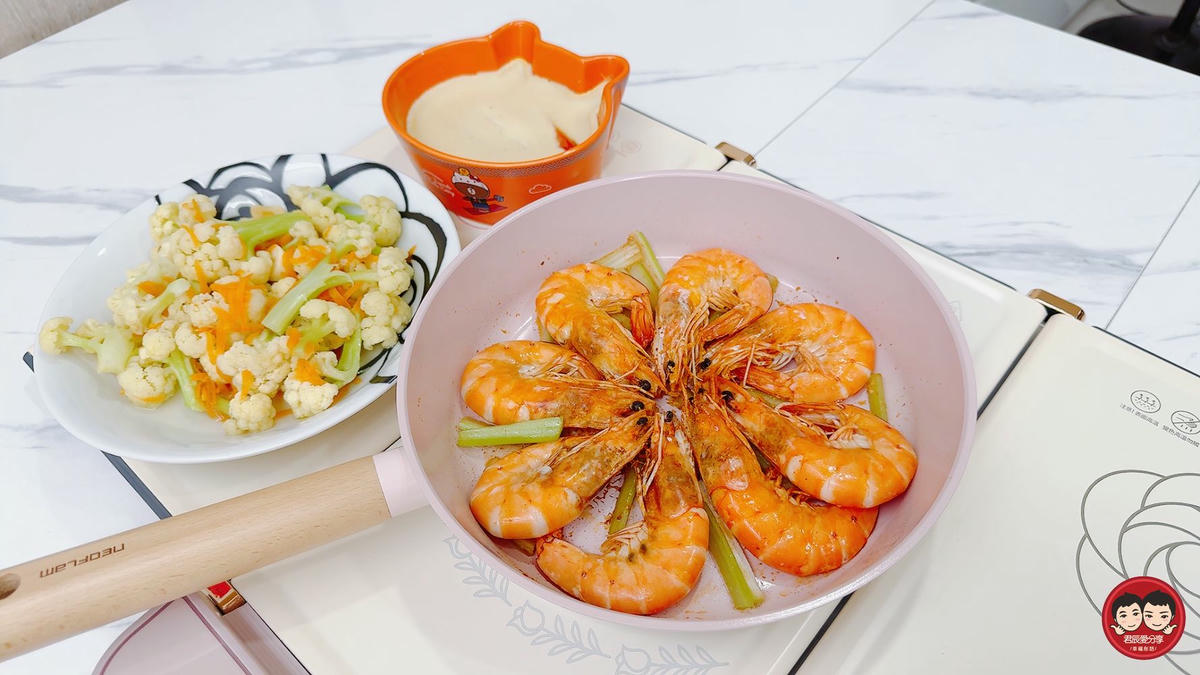 炒好香噴噴的蝦之後,直接整盤移到右側保溫板,保持完美溫度不冷掉~